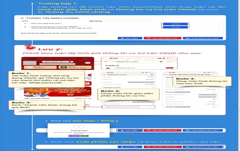Phụ huynh sẽ cần cập nhật các minh chứng sau: Ảnh giấy khai sinh của học sinh.Thông tin cư trú chụp từ app VNeID.